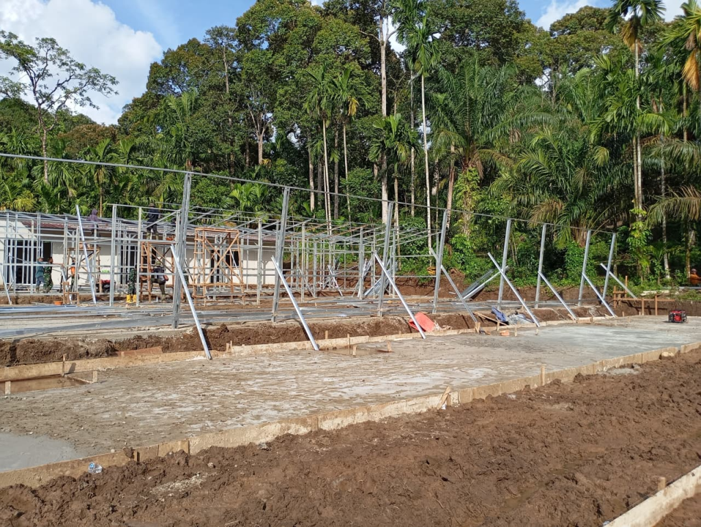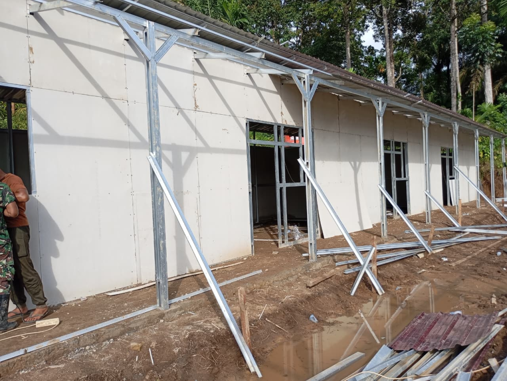 Hingga hari ini, proses pengerjaan huntara di Lapangan SDN 05 Kayu Pasak telah mencapai 50% dari target. Baja-baja ringan sebagai pondasi dan pembatas bangunan telah berdiri tegak. Pemasangan dinding mulai dilakukan bertahap. Empat unit alat berat juga terus bekerja pagi hingga malam.