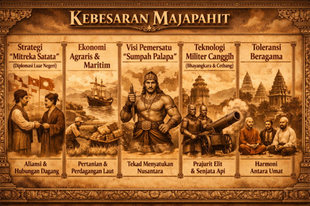 Selama lebih dari dua abad, Majapahit bukan sekadar bertahan. Ia tumbuh. Para sejarawan seperti Slamet Muljana dalam Tafsir Sejarah Nagarakretagama (1979) dan Agus Aris Munandar dalam studinya tentang budaya Majapahit menemukan bahwa kehebatan kerajaan ini bersandar pada lima pilar tata kelola yang saling menopang: diplomasi yang lentur, ekonomi yang cerdas, visi pemersatu yang berani, kekuatan militer yang inovatif, dan ruang spiritual yang lapang. Lima pilar inilah yang menjadi rahasia agung Majapahit.