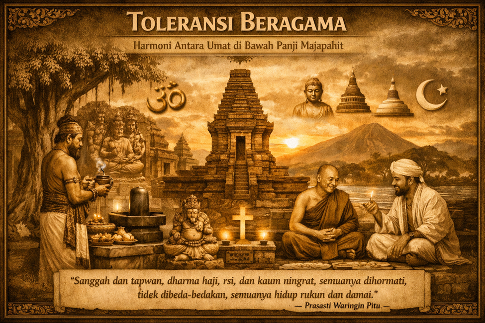 Mungkin pilar yang paling sering diremehkan namun paling fundamental dari keberhasilan Majapahit adalah kebijakan toleransi keagamaan yang sistematis dan deliberatif. Di tengah kerajaan yang dikenal sebagai Hindu-Buddha, berbagai keyakinan hidup berdampingan tanpa represi negara.